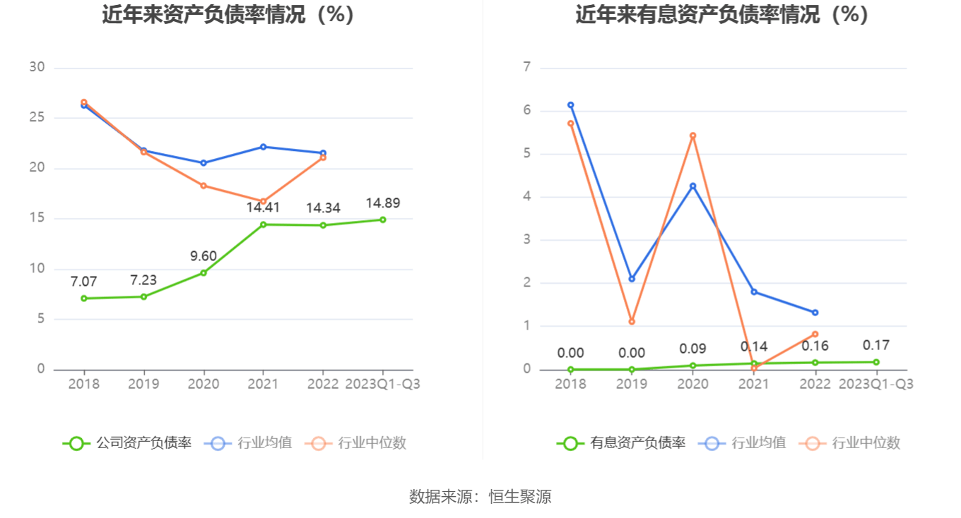 在偿债能力方面,公司2023年三季度末资产负债率为14.89%,相比上年末上升0.55个百分点;有息资产负债率为0.17%,相比上年末上升0.01个百分点。