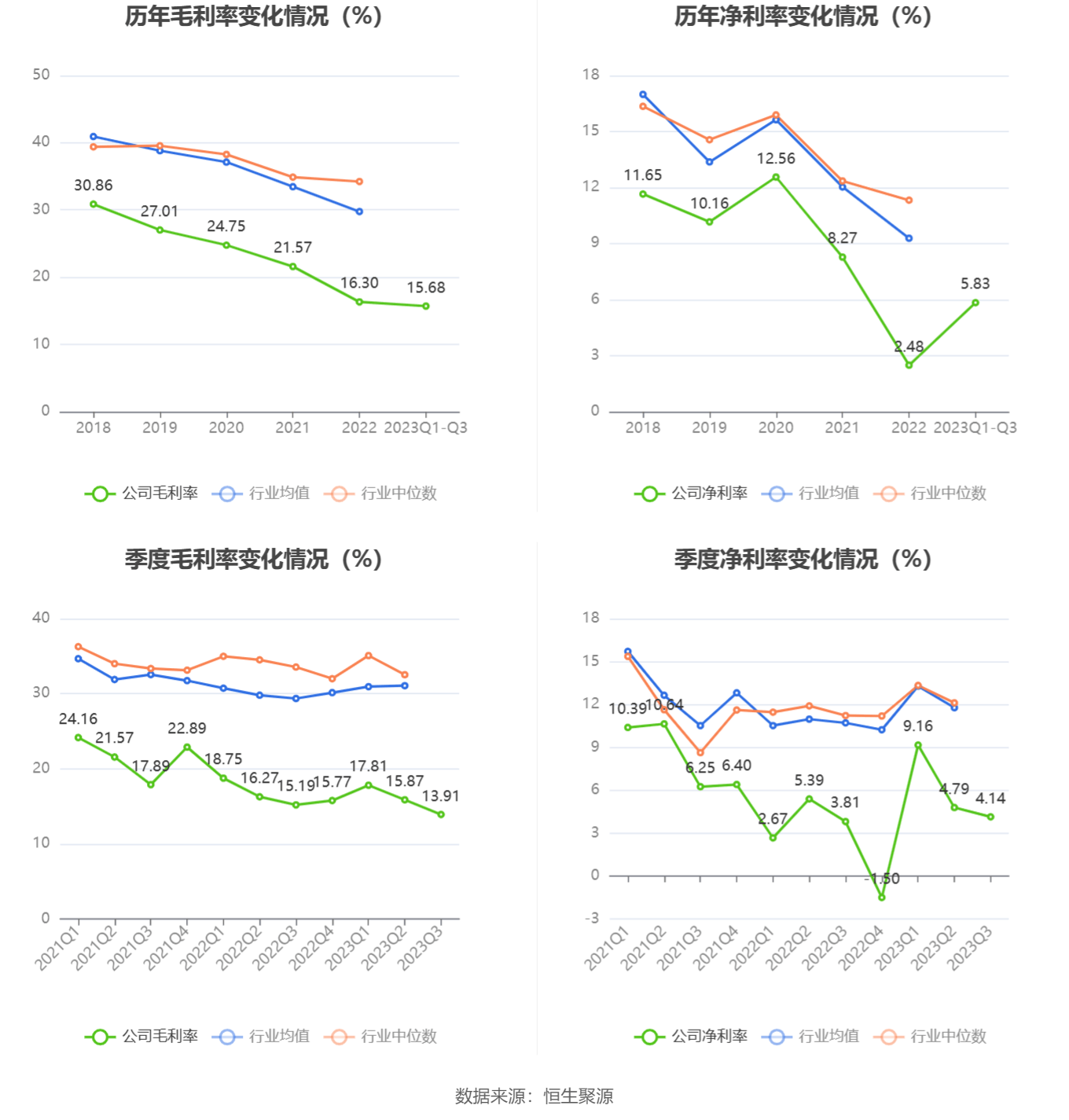 2023年前三季度,公司毛利率为15.68%,同比下降0.82个百分点;净利率为5.83%,较上年同期上升1.82个百分点。从单季度指标来看,2023年第三季度公司毛利率为13.91%,同比下降1.28个百分点,环比下降1.96个百分点;净利率为4.14%,较上年同期上升0.33个百分点,较上一季度下降0.65个百分点。