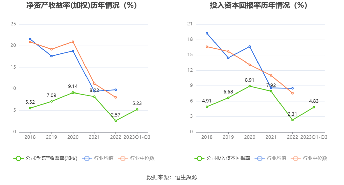 数据显示,2023年前三季度公司加权平均净资产收益率为5.23%,较上年同期增长2.26个百分点;公司2023年前三季度投入资本回报率为4.83%,较上年同期增长2.20个百分点。
