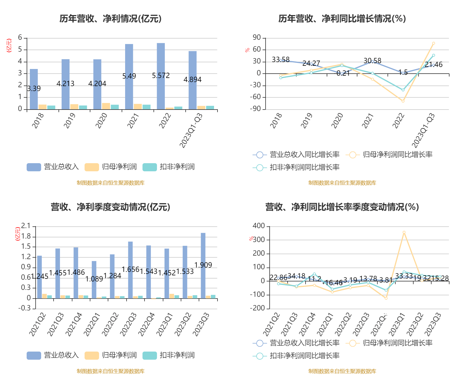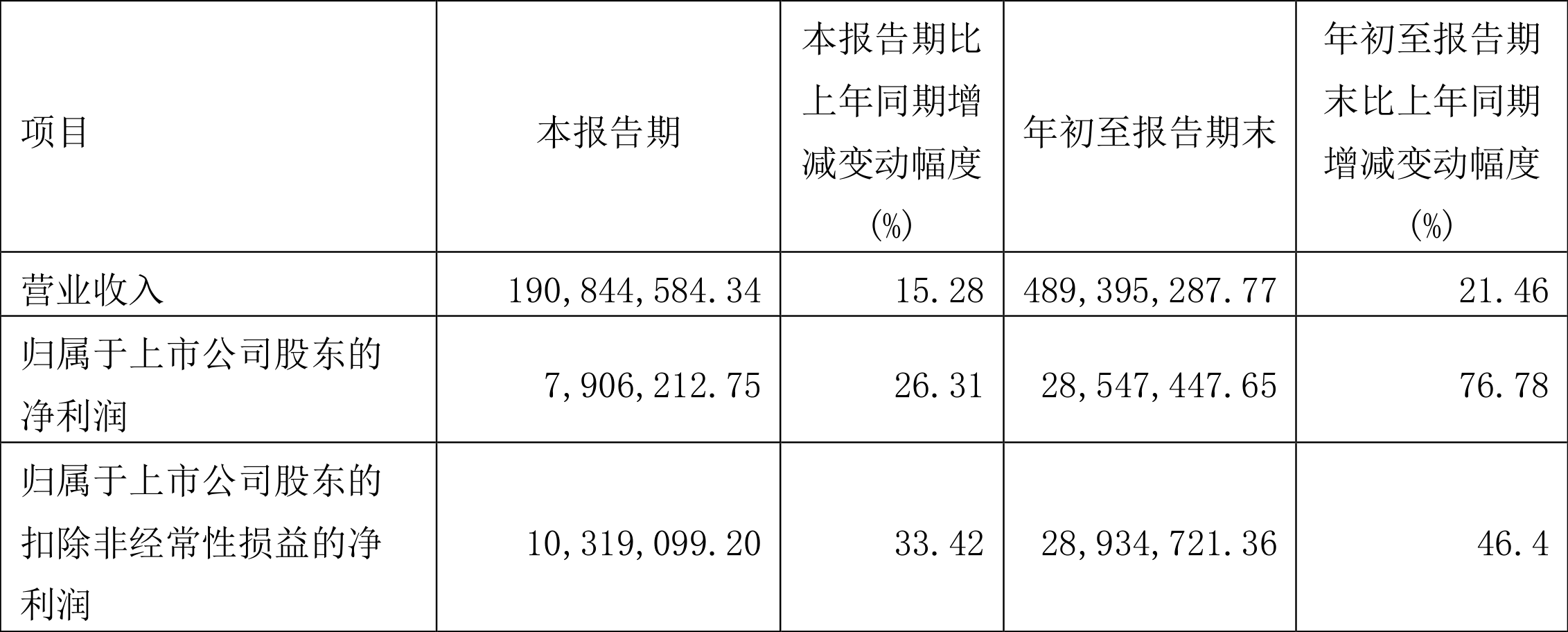 根据三季报,公司第三季度实现营业总收入1.91亿元,同比增长15.28%,环比增长24.52%;归母净利润790.62万元,同比增长26.31%,环比增长7.78%;扣非净利润1031.91万元,同比增长33.42%,环比增长9.8%。