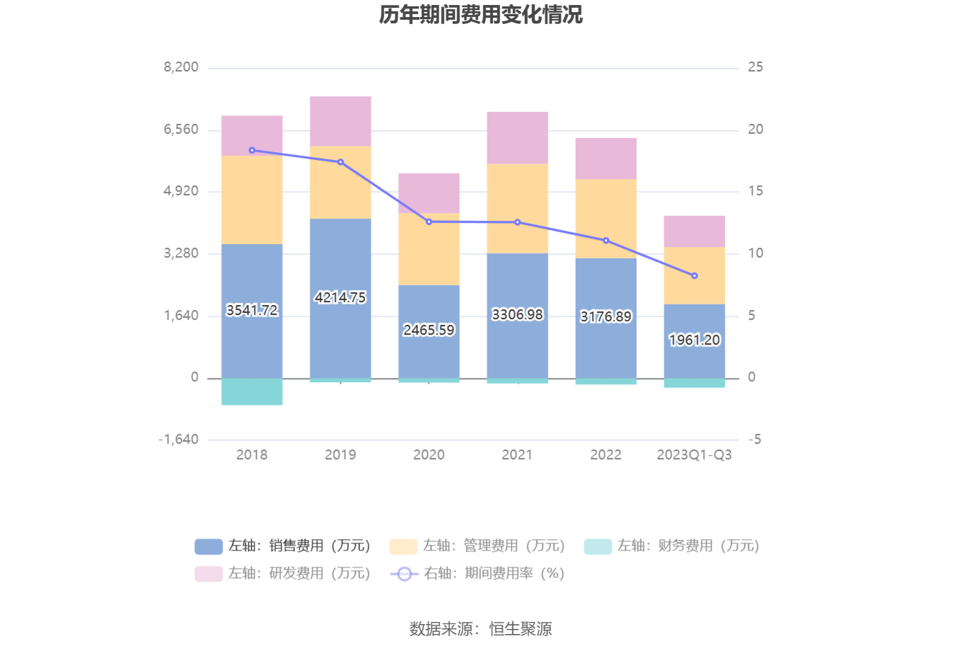 2023年前三季度,公司期间费用为4043.35万元,较上年同期减少204.59万元;期间费用率为8.26%,较上年同期下降2.28个百分点。其中,销售费用同比下降11.47%,管理费用同比增长0.92%,研发费用同比增长2.47%,财务费用由去年同期的-266.20万元变为-250.42万元。