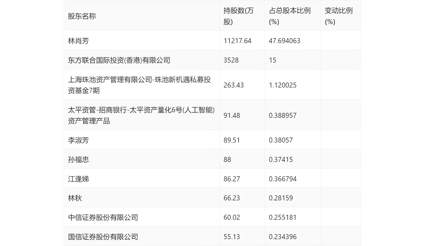 三季报显示,2023年三季度末公司十大流通股东中,新进股东为上海珠池资产管理有限公司-珠池新机遇私募投资基金7期、太平资管-招商银行-太平资产量化6号(人工智能)资产管理产品、江逢娣,取代了上半年末的MORGAN STANLEY & CO. INTERNATIONAL PLC.、葛勇峰、王永华。在具体持股比例上,林秋持股有所上升,中信证券股份有限公司、国信证券股份有限公司持股有所下降。