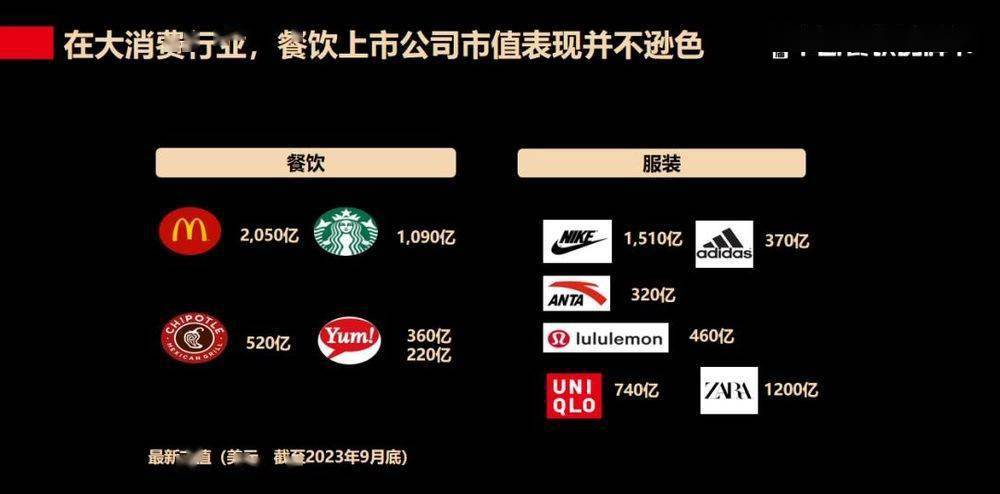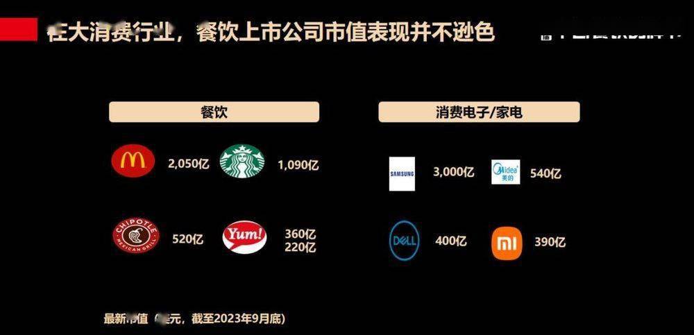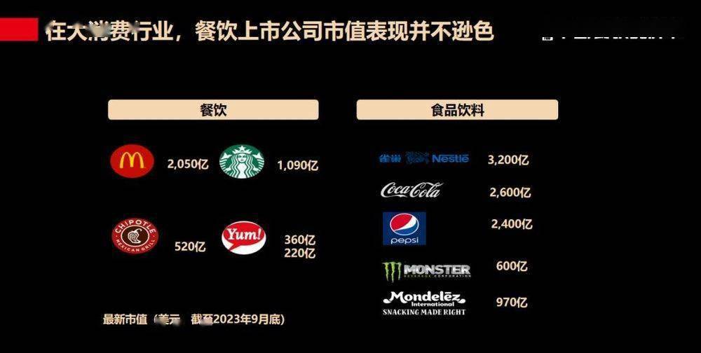 在全球范围内,从整个消费行业来看,餐饮上市公司的市值并不逊色于其它的赛道或品类。 全球最大的几家上市餐饮企业里, 麦当劳的市值第一,达到两千多亿美金 ;星巴克市值有一千多亿美金, 百胜的国际、国内,两大市场加起来也有将近600亿美金。