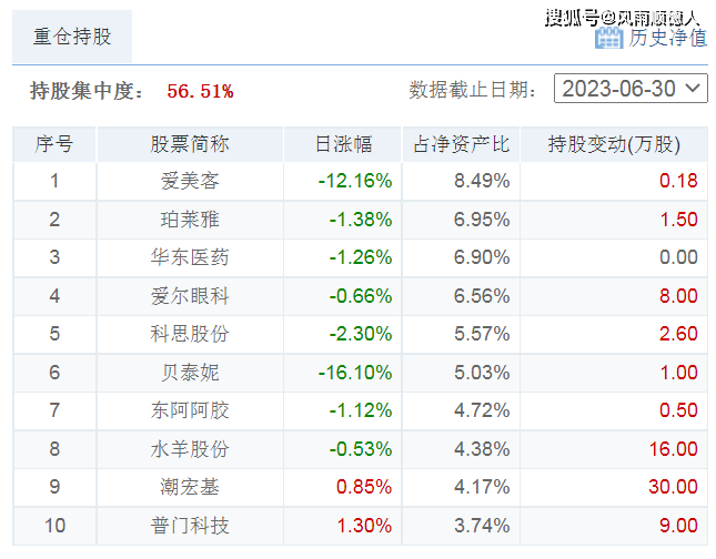 该基金的十大持仓中爱美客、贝泰妮、华厦眼科跌幅逾10%,其它持仓以下跌为主,前十大持仓占总持仓66.22%,基金的持仓风格偏向医美行业,基金净值相对跑输市场(属于医药细分行业的主动型混合基金) 【基金规模0.53亿元】。
