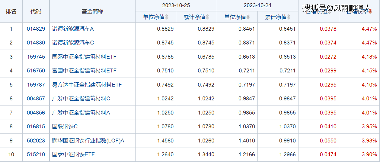 25日开放式基金净值增长排名前10的基金分别是:诺德新能源汽车A、诺德新能源汽车C、国泰中证全指建筑材料ETF、富国中证全指建筑材料ETF、易方达中证全指建筑材料ETF、广发中证全指建筑材料C、广发中证全指建筑材料A、国联钢铁C、鹏华国证钢铁行业指数(LOF)A、国泰中证钢铁ETF。