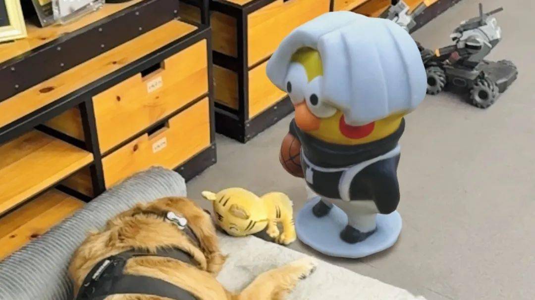 就算它离开了事故多发地,跑到同事座位下寻求庇护,结果被一个超大的卡布达玩偶拦住了去路。