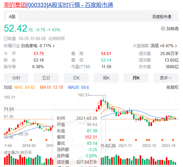 截至10月25日收盘,美的集团的股价不涨反跌了1%,为52.42元/股,相比2021年超百元的股价高点,已回撤49%,年内股价跌幅达29%。当天,其总市值跌破3700亿元。
