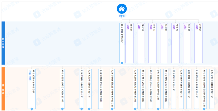 天眼查显示,何享健的儿子何剑锋是盈峰集团实控人,同时是12家公司的法人,在41家公司任职;何享健的两位女儿何倩嫦、何倩兴则在美的集团的上游产业发展,同样在数家公司任职。