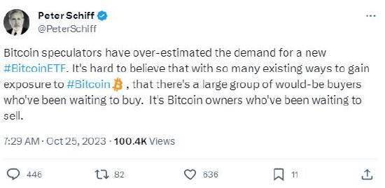 希夫在社交媒体平台X上发帖称:“比特币投机者高估了对新的比特币ETF的需求。很难相信,有这么多现有的接触比特币的方式,还会有一大群潜在买家一直在等待购买。是比特币持有者一直在等待出售。”