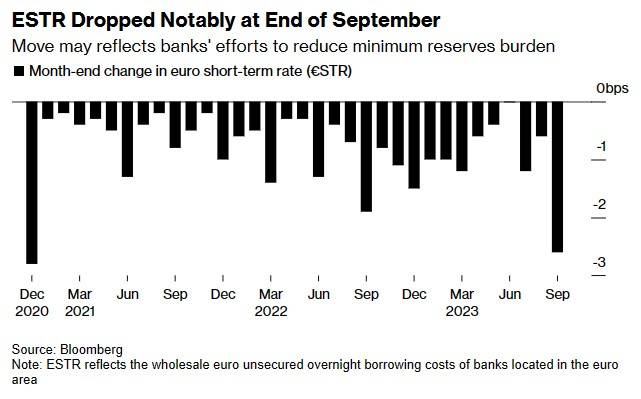 据悉,在欧洲央行于9月20日正式停止对存款准备金支付利息后,欧元区银行的无担保隔夜借款利率(ESTR)下降了2.6个基点,这是自2020年12月以来的最大月末降幅。德国商业银行的策略师Christoph Rieger表示,即使最低存款准备金率维持在1%,10月末的ESTR降幅可能还会更大。