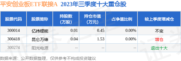 平安创业板ETF联接A为指数型-股票基金,根据最新一期基金季报显示,该基金资产配置:股票占净值比0.01%,债券占净值比3.01%,现金占净值比2.4%。基金十大重仓股如下: