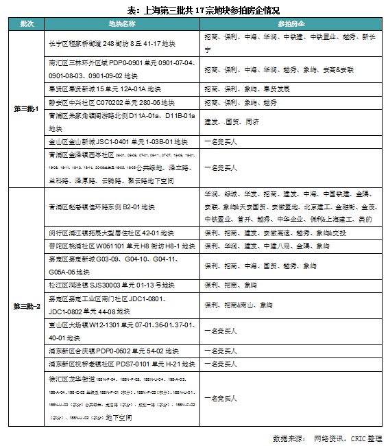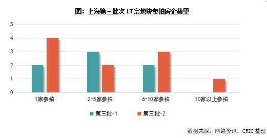 虽然国央企积极参拍,但从地块的角度来看,本轮地块参与热度不及第二批次,第二批次挂牌的24宗地块中有9宗的参拍房企数量达到10家以上,而本批次的地块参拍房企基本都在10家以下,仅有青浦赵巷地块参拍房企超过20家,一枝独秀。