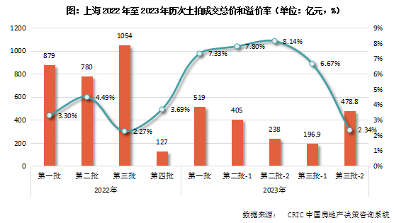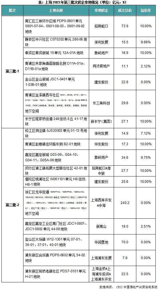 虽然从整体溢价率来看,第三批的两次土拍溢价率和触顶成交比例不及前几轮,但结合地块的实际情况来看,徐汇龙华地块起拍价240亿元、宝山地块是大型TOD综合地块,两宗地块总价较高、用途复杂,本身就有非常高的拿地门槛,且由于龙华地块总价过高,对整体的溢价率也有影响。