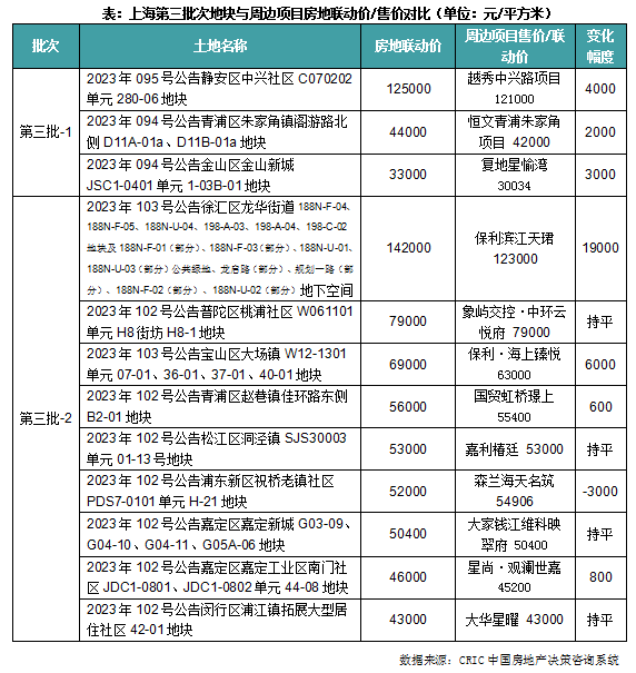 上海集中供地持续设置了房地联动价,对比本批次地块与周边地块的房地联动价或售价情况来看,本批次地块的房地联动价稳中有升:静安中兴社区地块可对标越秀在4月份拿下的306-04地块,房地联动价上浮4000元/平方米;徐汇区龙华街道大型综合地块,房地联动价142000元/平方米,比2022年成交的保利滨江天珺项目地块房地联动价提升1.9万元/平方米。此外普陀区桃浦地块、松江洞泾地块、嘉定新城地块等房地联动价都与周边项目持平。