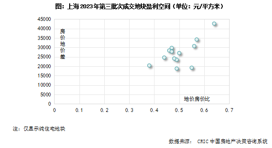 第三批次17宗地块中,有12宗为纯住宅用地,平均房价地价差26991元/平方米,比上一批次提升了大约2000元/平方,平均地价房价比0.5,比上一轮次减少0.06,整体来看,本批次的纯住宅地块在盈利方面空间更高。