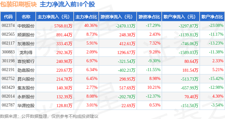 从资金流向上来看,当日包装印刷板块主力资金净流出490.28万元,游资资金净流出3464.64万元,散户资金净流入3954.92万元。包装印刷板块个股资金流向见下表: