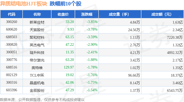 证券之星消息,10月25日异质结电池HJT板块较上一交易日下跌0.36%,新莱应材领跌。当日上证指数报收于2974.11,上涨0.4%。深证成指报收于9528.31,上涨0.47%。异质结电池HJT板块个股涨跌见下表: