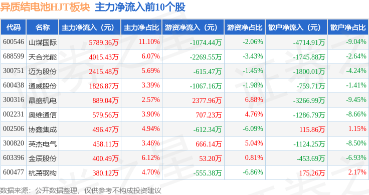 从资金流向上来看,当日异质结电池HJT板块主力资金净流出4.76亿元,游资资金净流入1.63亿元,散户资金净流入3.13亿元。异质结电池HJT板块个股资金流向见下表: