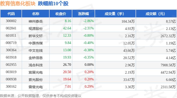 从资金流向上来看,当日教育信息化板块主力资金净流入3011.76万元,游资资金净流出1.65亿元,散户资金净流入1.35亿元。教育信息化板块个股资金流向见下表: