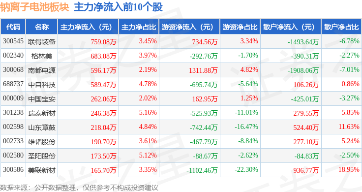 从资金流向上来看,当日钠离子电池板块主力资金净流出3.64亿元,游资资金净流入2.42亿元,散户资金净流入1.21亿元。钠离子电池板块个股资金流向见下表:
