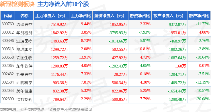 从资金流向上来看,当日新冠检测板块主力资金净流出3644.13万元,游资资金净流入1.59亿元,散户资金净流出1.22亿元。新冠检测板块个股资金流向见下表: