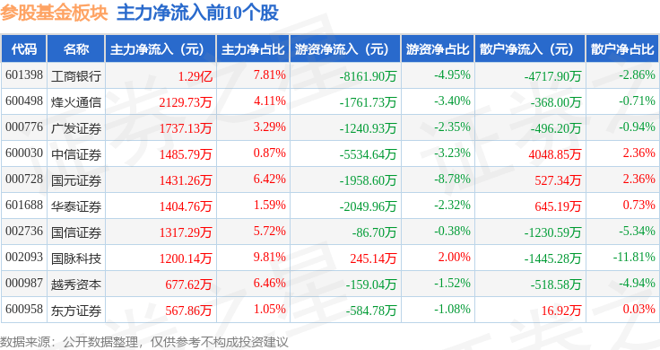 从资金流向上来看,当日参股基金板块主力资金净流出8.31亿元,游资资金净流入1.03亿元,散户资金净流入7.29亿元。参股基金板块个股资金流向见下表: