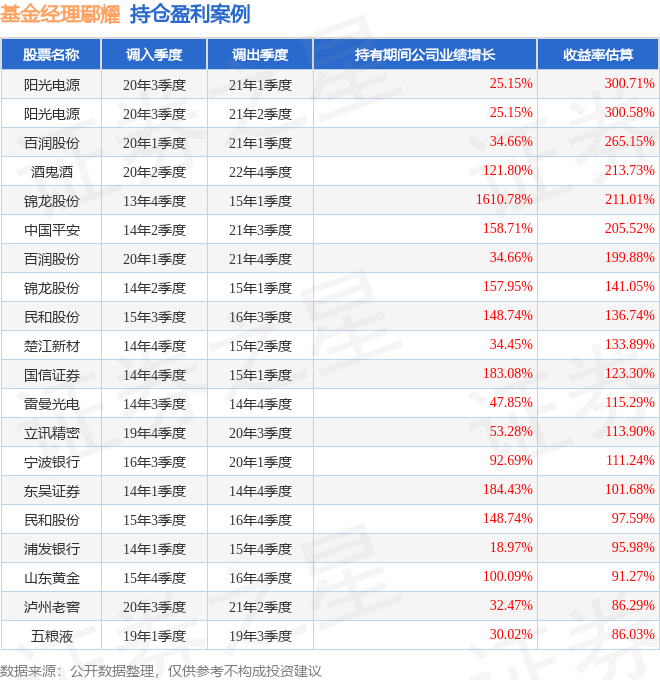 鄢耀管理的工银总回报灵活配置混合A基金在20年3季度买入阳光电源,在持有2个季度后在21年1季度卖出。持有期间的估算收益率为300.71%,持有期间阳光电源在2020年到2021年的年报营业总收入增幅达25.15%。