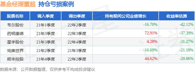 董超管理的汇添富智能制造股票A基金在21年1季度买入韦尔股份,在持有1年又1个季度后在22年2季度卖出。持有期间的估算收益率为-42.12%,持有期间韦尔股份在2021年到2022年的年报营业总收入降幅为16.7%。
