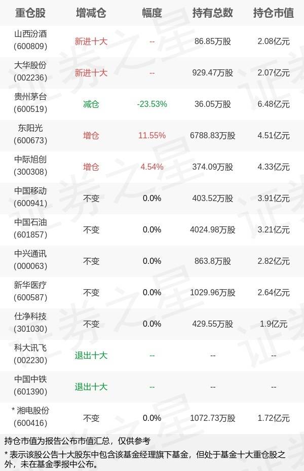 证券之星消息,10月25日博时基金旗下吴渭管理的博时汇兴回报一年持有期灵活配置混合型基金公布三季报,近1年净值增长率-16.11%。与上一季度相比,该基金前十大重仓股新增山西汾酒,大华股份;其中贵州茅台持仓占比8.98%,为该基金第一大重仓股;科大讯飞,中国中铁等退出前十大重仓股;详细数据如下: