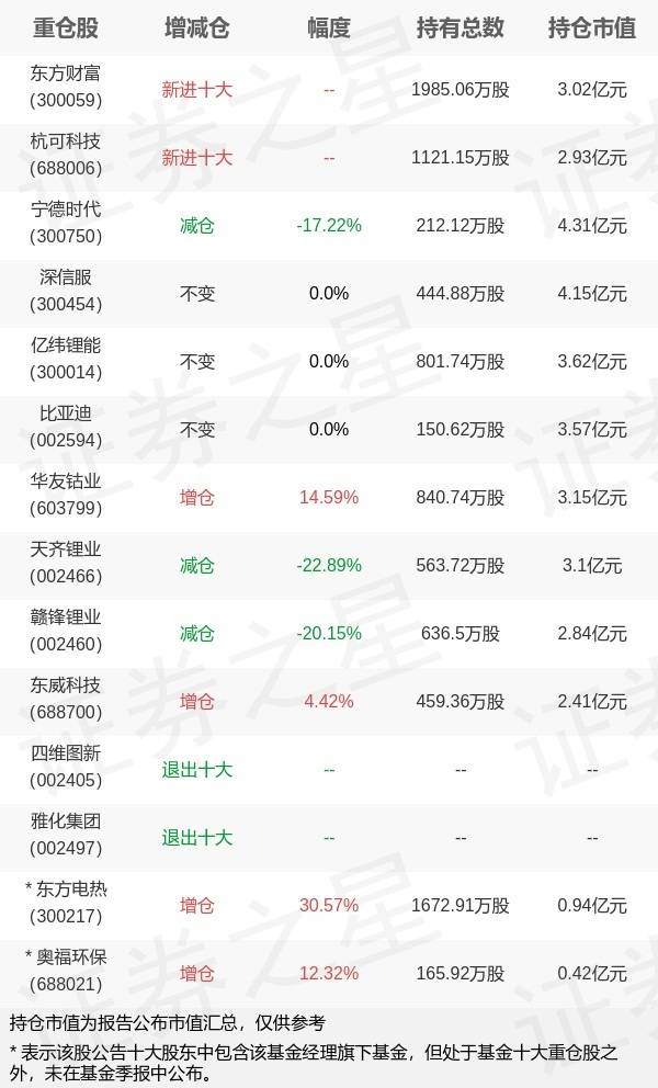 证券之星消息,10月25日汇丰晋信基金旗下陆彬管理的汇丰晋信低碳先锋股票型基金公布三季报,近1年净值增长率-29.95%。与上一季度相比,该基金前十大重仓股新增东方财富,杭可科技;其中宁德时代持仓占比8.21%,为该基金第一大重仓股;四维图新,雅化集团等退出前十大重仓股;详细数据如下: