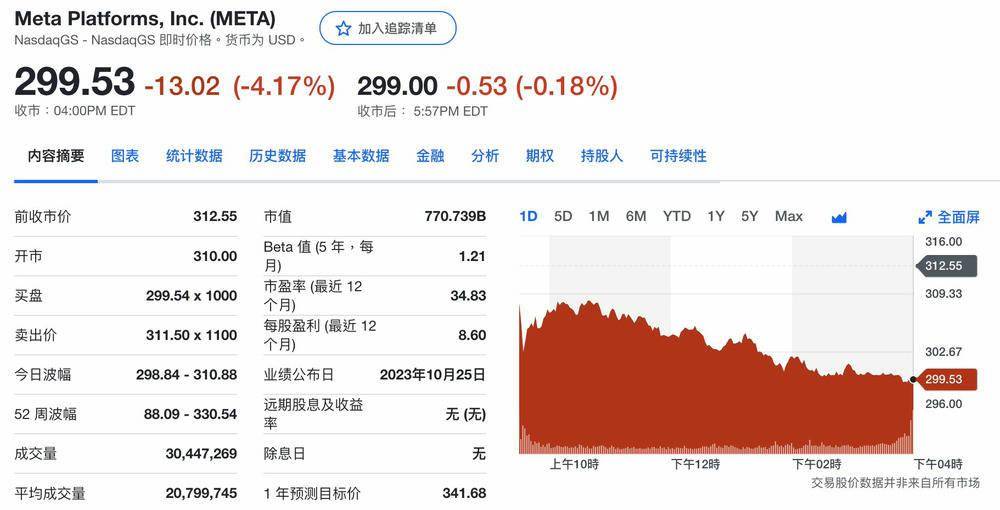 Meta 周三在纳斯达克交易所开盘报 310 美元。截至周三收盘,Meta 股价下跌 13.02 美元,报收于 299.53 美元,跌幅为 4.17%。