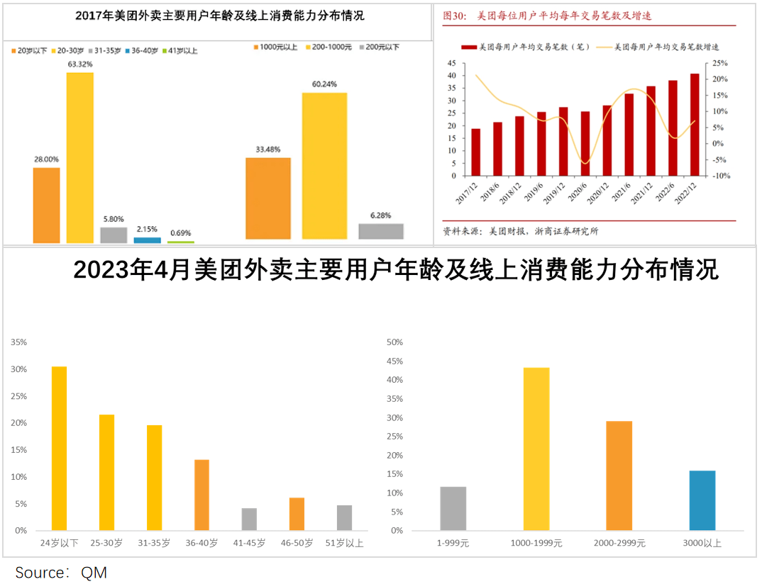 如下图,近5年,随着美团外卖主要用户群体年龄的增加,消费能力、每用户交易笔数也在明显攀升。(当然也有收入、物价提升、餐饮行业品牌化发展等因素影响)