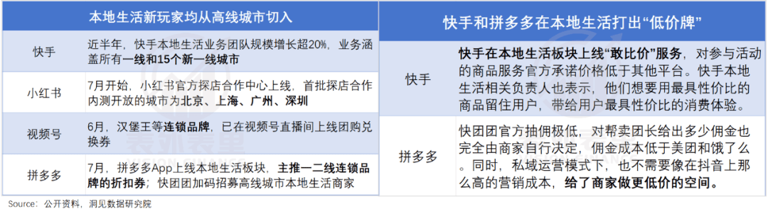 今年以来,快手、小红书、视频号甚至拼多多,都相继加码本地生活,并且多是从一二线城市开始切入,大打“低价牌”。