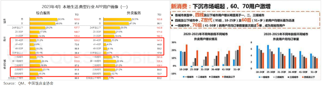 QM数据显示,本地生活业务在下沉市场及40岁以上人群中渗透率低,仍有较大的增长空间。以美团外卖为例,三四线城市用户占比仅25%,35岁及以上用户占比仅23%,且这个群体近两年崛起趋势明显。