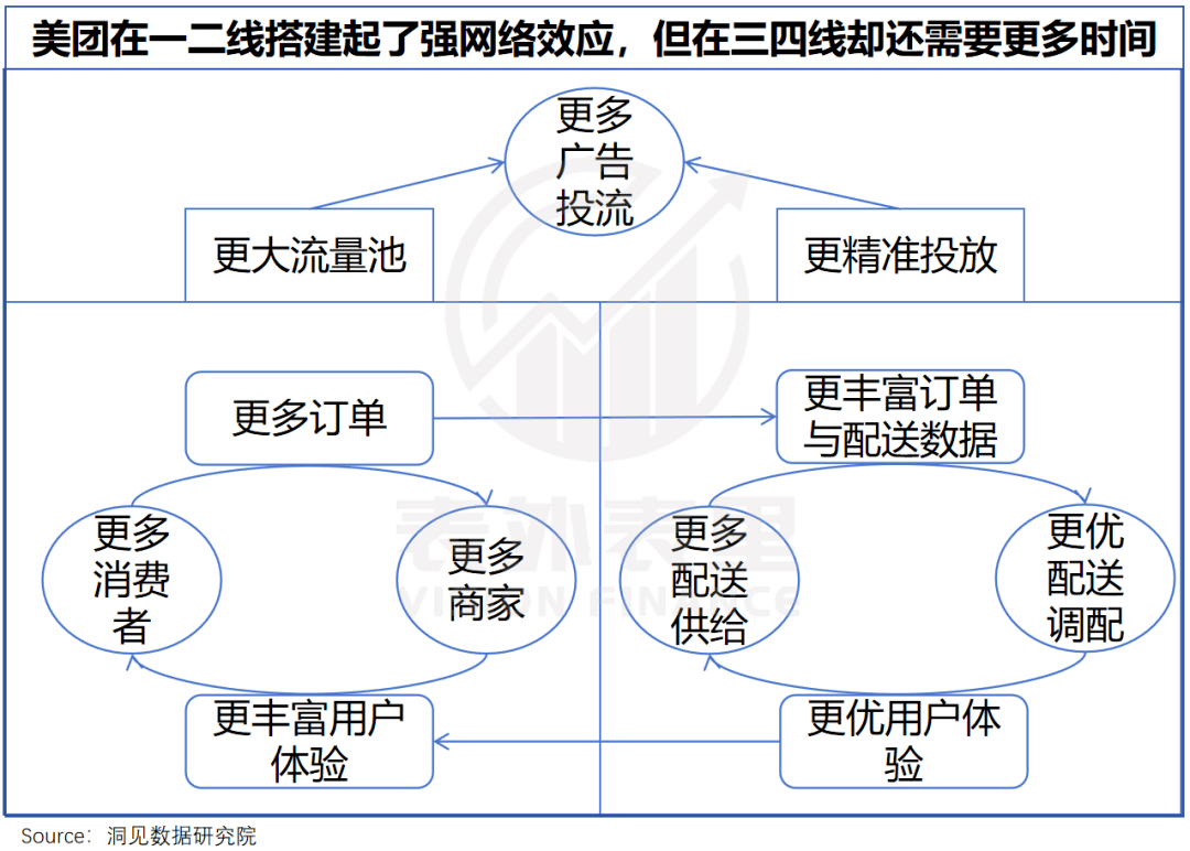 这样一来,美团在高线城市的强网络效应,到了这里有些“水土不服”。
