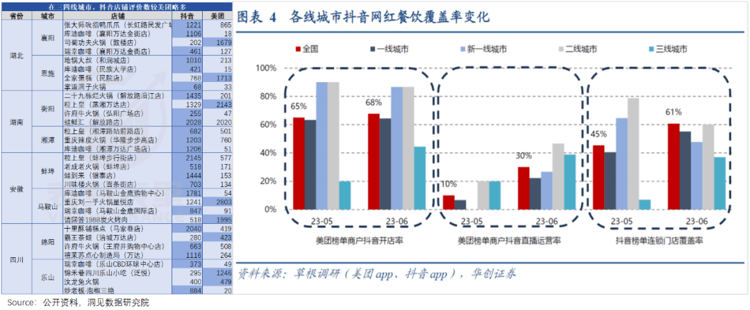 如下图,一些商铺在美团和抖音挂的是相同的价格,可抖音的评论数量会多一些。商家端的情况也类似,草根调研显示,今年6月三线城市的美团榜单中,抖音开店率、直播运营率、连锁门店覆盖率都有提升。