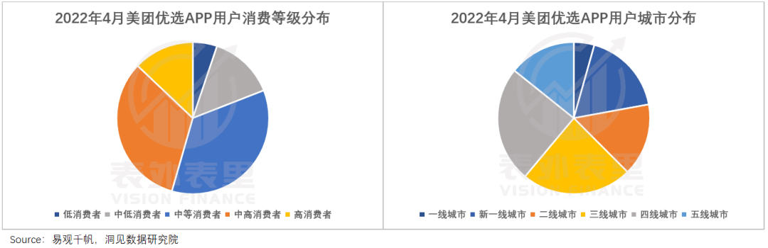 如下图,去年4月的数据显示,美团优选用户更多集中在中高线城市,且属于中高消费水平。