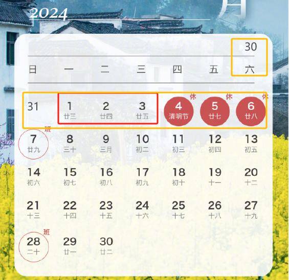 不同于元旦和端午节,清明节(4月4日)处于周中,需要调休实现“3天小长假”:4月4日至6日放假调休,共3天。4月7日(星期日)上班。