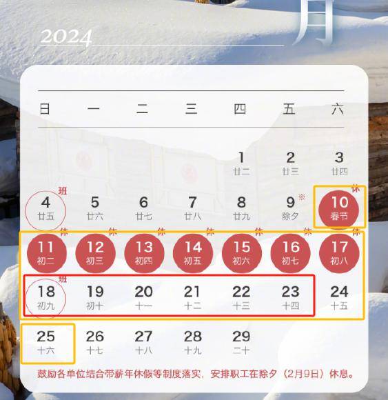 需要注意的是,国家鼓励各单位结合带薪年休假等制度落实,安排职工在除夕(2月9日)休息。如果公司“给力”,即可轻松获得一个9天超长假期。