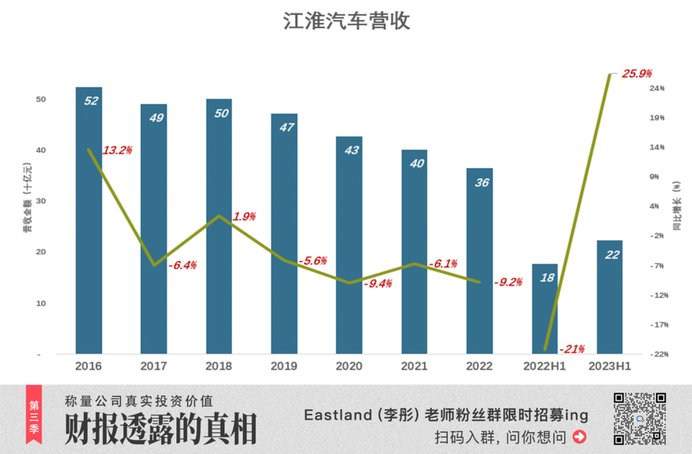 2016年,江淮汽车扣非净利润8.43亿、利润率1.6%。此后扣非净利润连续六年为负,2022年扣非净亏损27.9亿、亏损率7.7%。