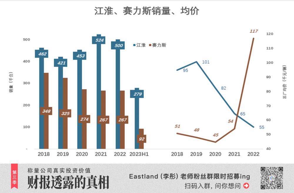 2022年赛力斯销量回升到江淮的53%,2023年H1又降至江淮的33%。