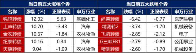 【转债市场指数集体收涨】 10月25日,转债市场早盘迅速走高,此后维持高位震荡,当日中证转债、上证转债、深证转债分别收涨0.47%、0.35%、0.69%。当日,转债市场成交额454.61亿元,较前一交易日增加39.13亿元。转债市场超八成个券上涨,560只个券中,440只上涨,102只下跌,18只持平。当日,锦鸡转债涨超12%,上声转债、金农转债、纽泰转债涨超10%,天康转债涨超9%,亚康转债、瑞鹄转债涨超6%;下跌个券中,尚荣转债跌逾6%,继续领跌市场,精测转2跌逾3%、飞凯转债、G三峡EB1、精测转债等6只转债跌逾2%。