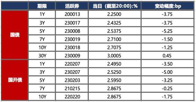 10月25日,1万亿国债增发消息债市已消化,资金面转松提振债市情绪,短券明显强势,银行间主要利率债收益率多数大幅下行。截至北京时间20:00,10年期国债活跃券230018收益率下行1.25bps至2.7075%;10年期国开债活跃券220220收益率下行1.75bps至2.8675%。