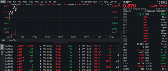 截止目前,消费ETF(159928)上涨0.69%,当前成交额突破2000万。