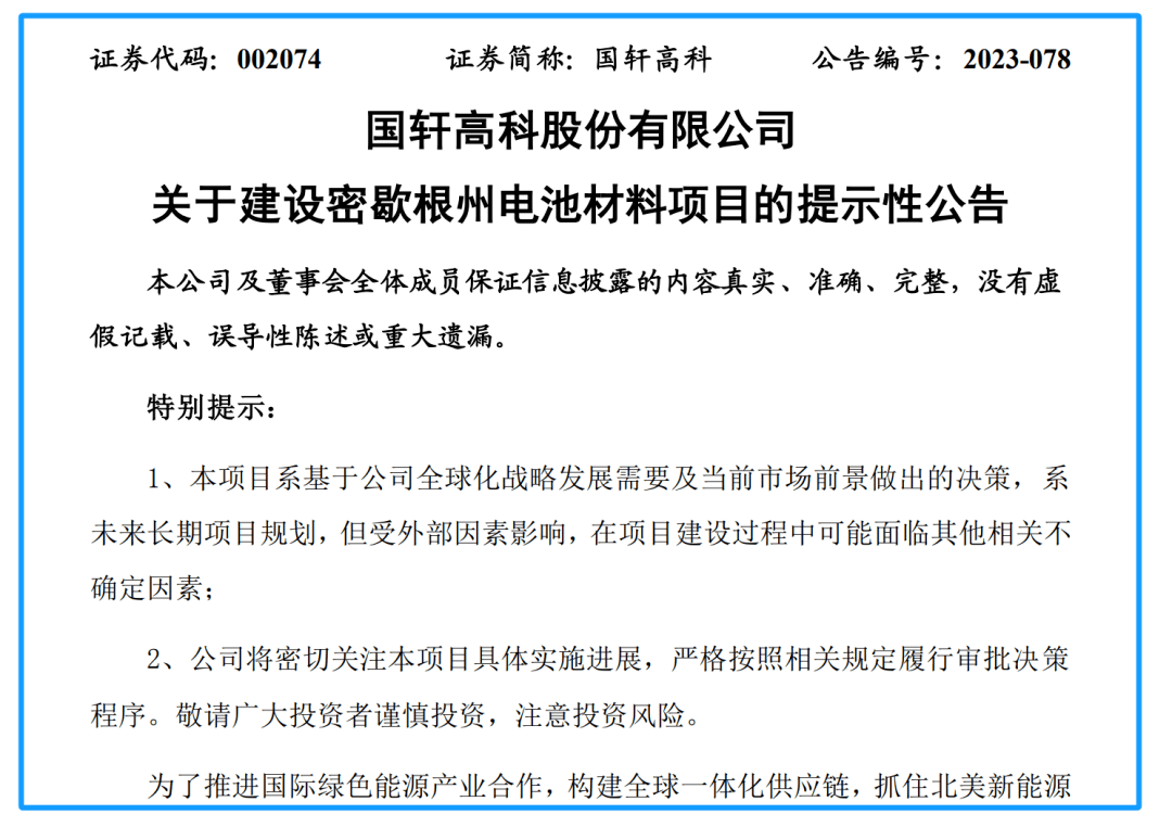 从最新公告的情况来看,国轩高科赴美投建材料工厂事项已经靴子落地,而工厂选址与投资额与此前消息基本相符。