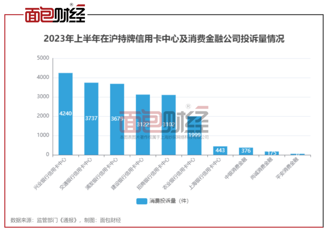 数据显示,在沪持牌信用卡中心及消费金融公司投诉量的中位数为2550.5件,招商银行信用卡中心投诉量是中位数的1.22倍。