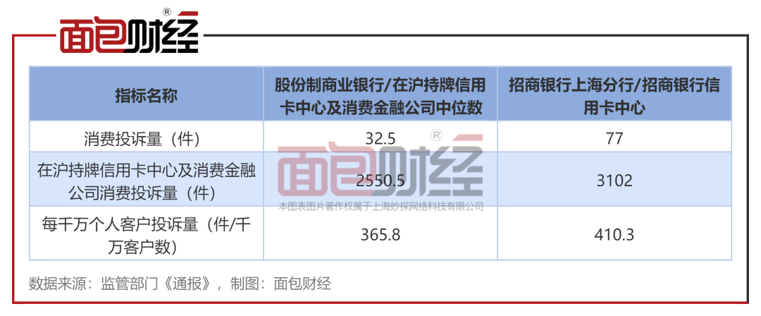 数据显示,在沪持牌信用卡中心及消费金融公司的平均每千万个人客户投诉量的中位数为365.8件,招商银行信用卡中心的投诉量是中位数的1.12倍。