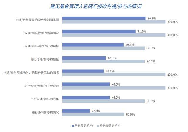 与其他类型的资产所有者相比,养老金对股东参与和尽责管理的关注和投入更为突出,对尽责管理政策的覆盖相对更为全面,要求基金管理人定期汇报的沟通/参与内容和范围也更加广泛,且所有的养老金受访机构都要求基金管理人对投资组合中的公司进行沟通/参与。