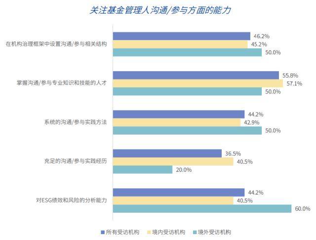 对基金管理人实施尽责管理的要求方面,过半受访机构表示总是会考虑基金管理人实施沟通/参与的能力,其中掌握沟通/参与专业知识和技能是基金管理人备受关注的能力之一。八成受访机构建议基金管理人定期汇报沟通/参与覆盖的资产类别和比例。目前超过半数的受访机构对中国的基金管理人的尽责管理能力感到满意,且境外机构对基金管理人的能力有更高的期待。