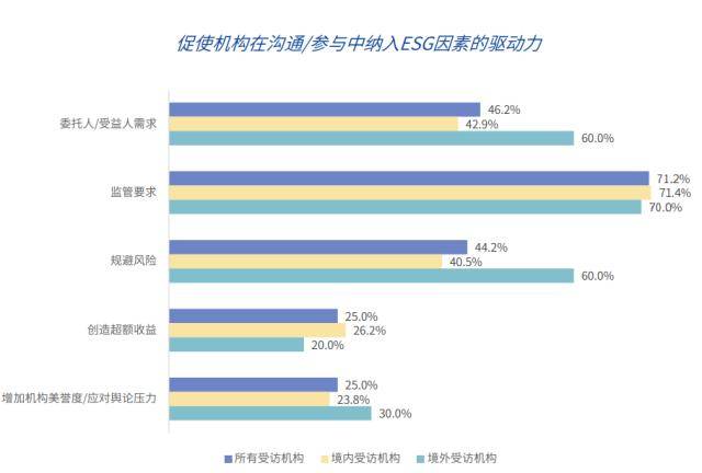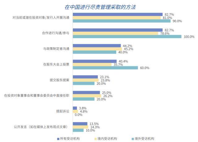 报告发现,在股东参与和尽责管理理念与实践方面,受访机构制定的尽责管理政策形式多样化,八成受访机构已开展股东参与和尽责管理,且沟通/参与行动由专职尽责管理人员或者内部投资团队等完成。七成受访机构认为监管要求是推动投资者在沟通/参与中纳入ESG的重要因素之一。